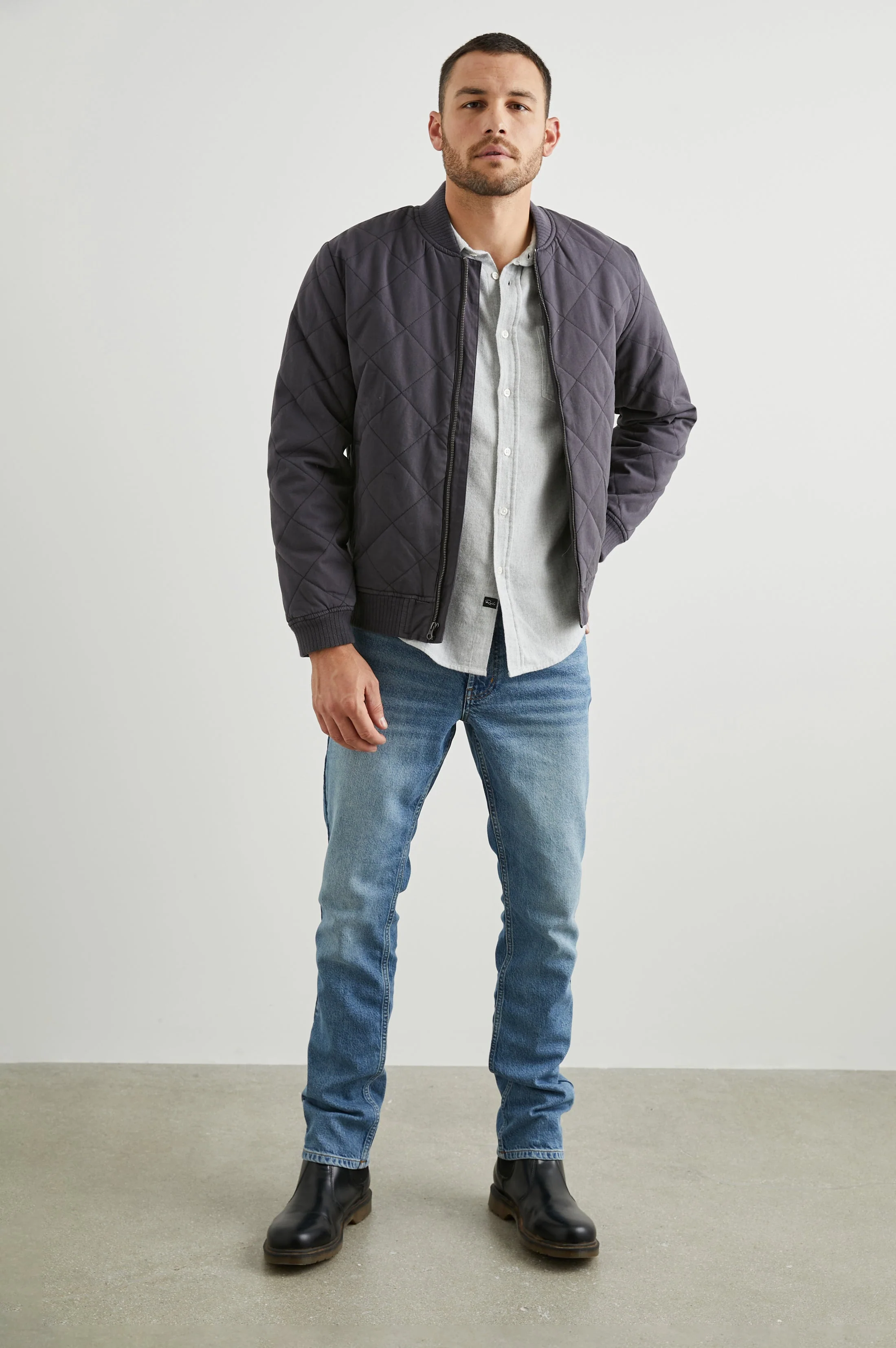 Lightweight, cotton-stretch blend, vintage black quilted bomber style jacket, and rib trim. This style is made for transitional weather and is an easy way to elevate any outfit with minimum effort.